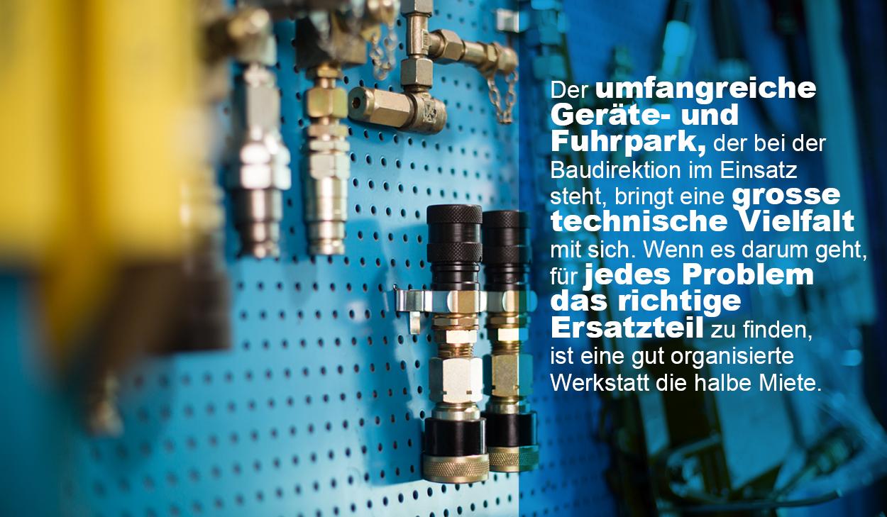 Falls du wissen willst, warum die Baudirektion über einen so grossen und vielfältigen Fuhrpark verfügt, den es zu unterhalten gilt: Der Blick auf die Aufgabengebiete, die nur schon das Tiefbauamt übernimmt, liefert einen Teil der Antwort.