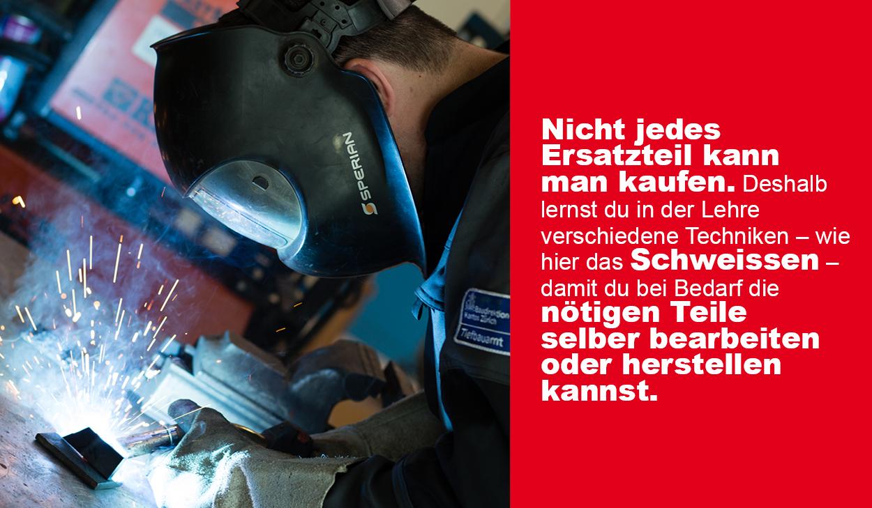 Die Zentralwerkstatt, in der du deine Berufslehre absolvierst, gehört zum Strasseninspektorat. Diese grosse und wichtige Abteilung des kantonalen Tiefbauamts kümmert sich um den Unterhalt und den Betrieb der Zürcher Staatsstrassen.