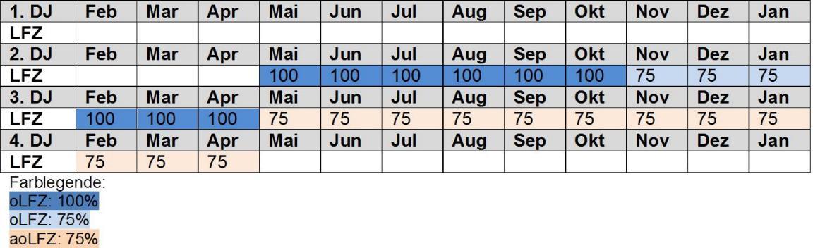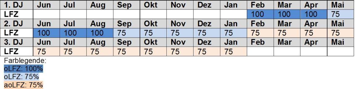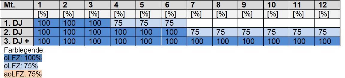 - im zweiten Dienstjahr: 6 Monate zu 100% und 6 Monate zu 75%