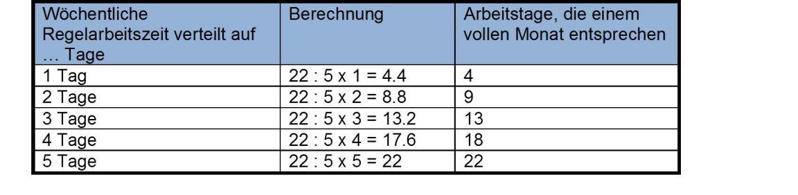 Voller Monat = 22 Arbeitstage : 5 Arbeitstage x Anzahl Tage der wöchentlichen Regelarbeitszeit