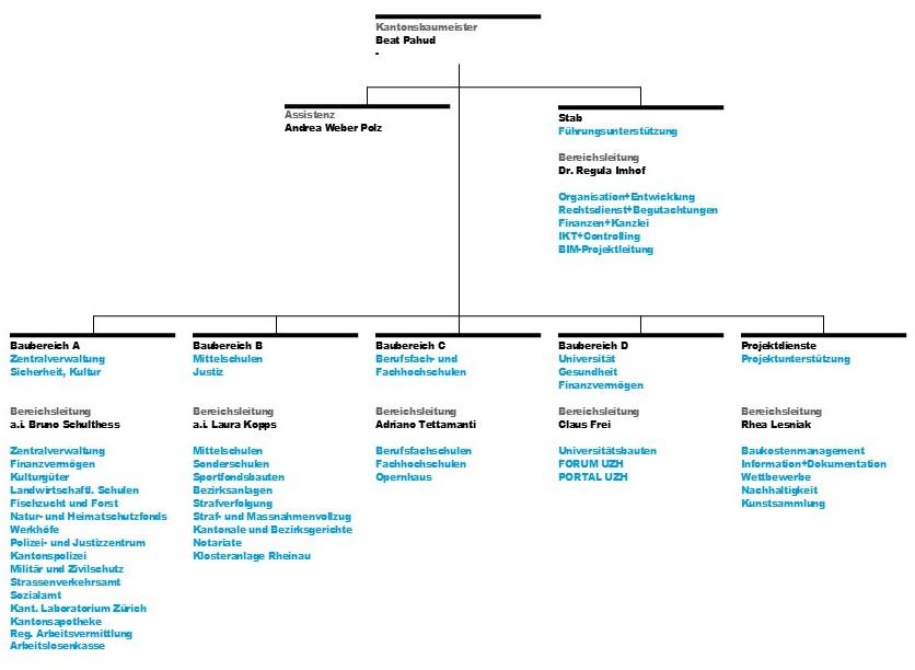 Organisatorisch ist das Hochbauamt Kanton Zürich in sechs Abteilungen unterteilt – vier Baubereiche, der Stab und die Projekdienste.