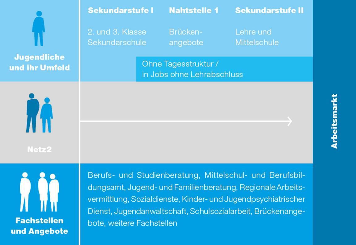 Netz2 ist ein Angebot zur Unterstützung von Jugendlichen und jungen Erwachsenen ohne Berufs- oder Mittelschulabschluss. Fachpersonen beraten und informieren junge Erwachsene durch die niederschwellige Anlaufstelle ÜBER18 oder koordinieren im Case Management Berufsbildung das Netzwerk und begleiten bei sämtlichen notwendigen Schritten bis zum erfolgreichen Ausbildungsabschluss.