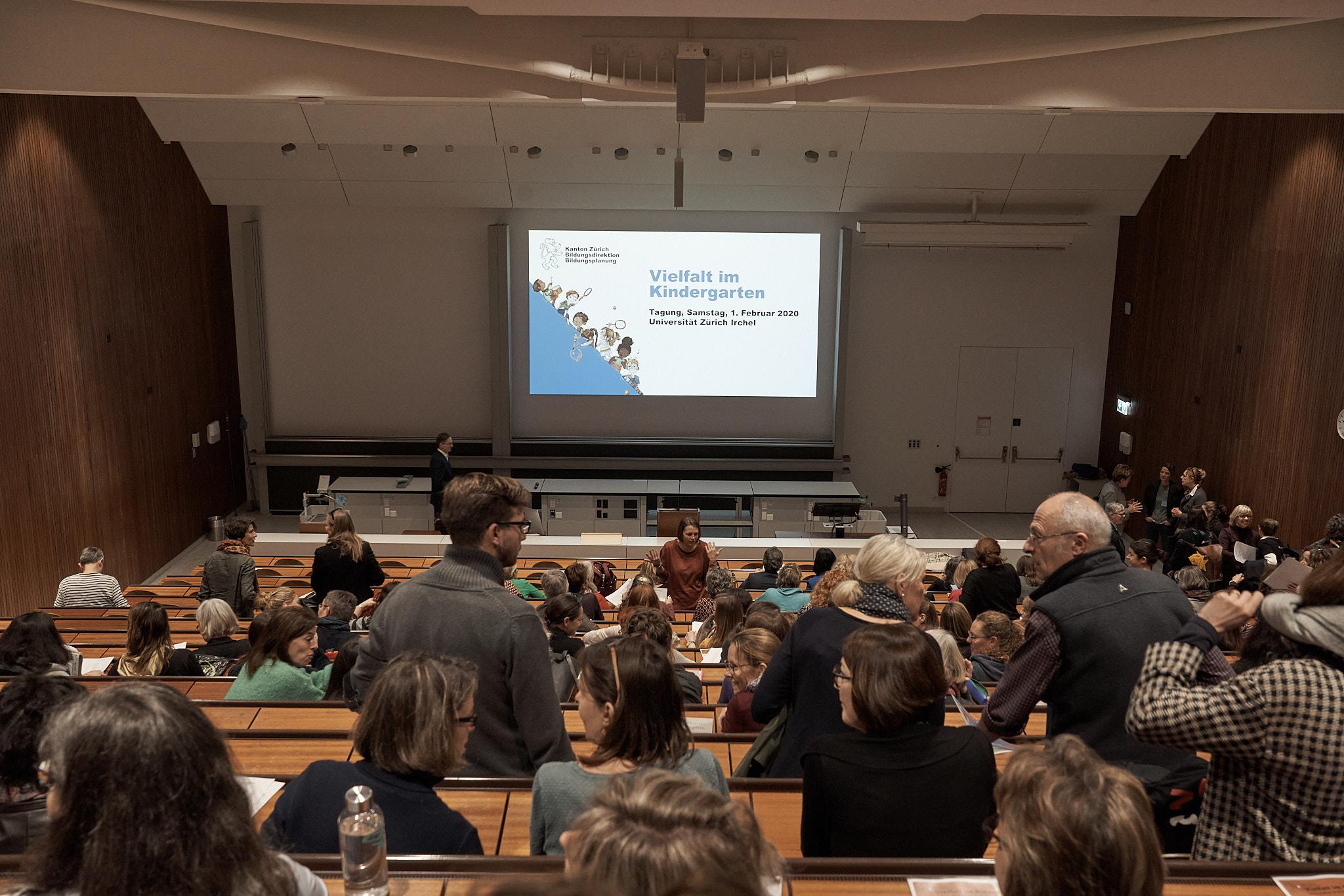 Am 1. Februar 2020 veranstaltete die Bildungsdirektion – ausgehend von den Ergebnissen des Berichts «Situation des Kindergartens im Kanton Zürich» – eine Tagung zum Thema Vielfalt. Ziel war, ein gemeinsames Verständnis zwischen Praxis und Wissenschaft zum Umgang mit Vielfalt im Kindergarten zu schaffen. Der Austausch zu diesen Fragen gab vor allem auch den Stimmen aus der Praxis Gewicht. An der gut besuchten Tagung an der Universität Irchel nahmen 250 Personen teil, mehrheitlich Lehrpersonen des Kindergartens im Kanton Zürich sowie Fachpersonen aus der weiteren Praxis und der Wissenschaft. Neben zwei Keynotes thematisierten acht Workshops vertiefende Fragen dazu (siehe Videos mit den Workshopergebnissen). Nach der Begrüssung durch Bildungsdirektorin Dr. Silvia Steiner hielten Prof. Dr. Doris Edelmann und Prof. Dr. Evelyne Wannack, beide von der PH Bern, die Hauptreferate. Den Abschluss machte der Komiker, Punk-Musiker und ursprüngliche Kindergarten-Lehrer Dominic Deville.