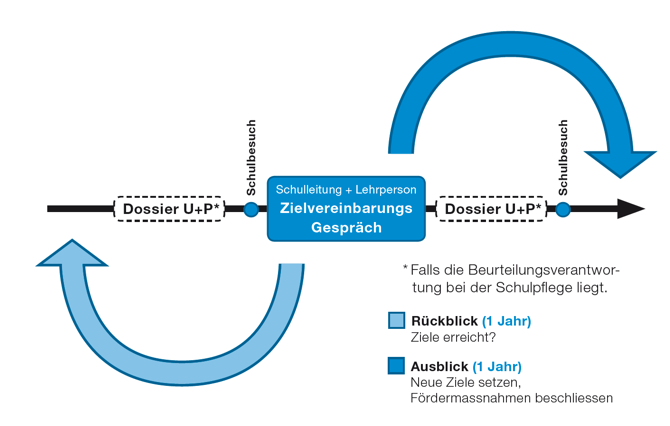 - Ein jährliches Mitarbeitendengespräch zwischen Schulleitung und Lehrperson mit Rückmeldung zum Unterrichtsbesuch, mit der Beurteilung der Ziele des Vorjahres und Zielvereinbarung für das nächste Jahr sowie der Beurteilung der Leistungen und des Verhaltens der Lehrperson.
