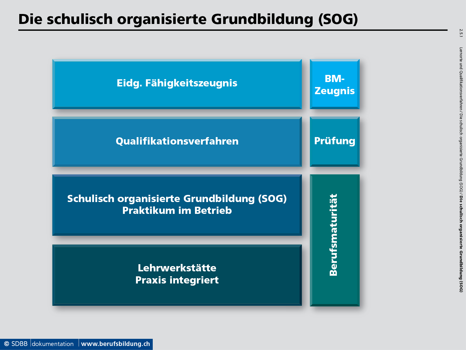 Die berufliche Grundbildung kann als Berufslehre in einem Betrieb (duales System) oder in einem schulischen Vollzeitangebot (schulisch organisierte Grundbildung (SOG)) erworben werden.