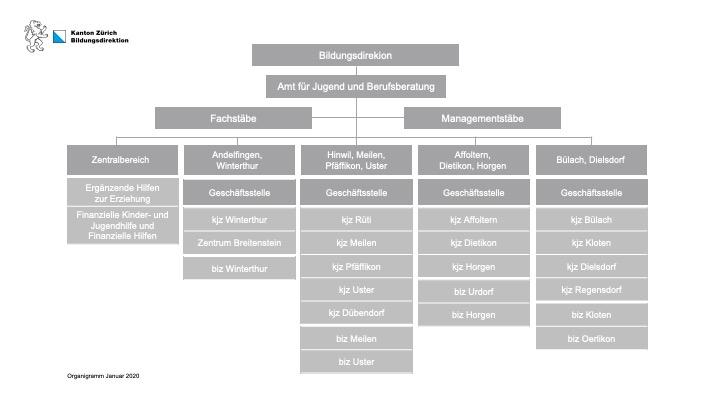 Die Leistungen des AJB werden hauptsächlich in den biz und in den kjz erbracht sowie in den regionalen Geschäftsstellen und der Zentralverwaltung in Zürich-Oerlikon. Vier Verwaltungseinheiten stellen die Leistungen für die jeweilige Region sicher.