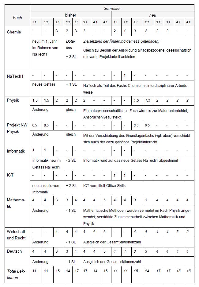 Die Aufstockung der Dotation im Fach Chemie um vier Semesterlektionen bedingt einen anderweitigen Abbau von drei Semesterlektionen, damit die Obergrenze von 132 Lektionen in den vier MAR-Jahren eingehalten wird. Die Fächer Mathematik, Wirtschaft und Recht sowie Deutsch werden deshalb je um eine Semesterlektion gekürzt. Der Abbau im Fach Mathematik kann durch die künftig verstärkte Zusammenarbeit in den Fächern Physik und Mathematik aufgefangen werden. Der Abbau im Fach Deutsch ist nicht übermässig gross, da er das Kurzsemester 4.2 betrifft. Das Fach Wirtschaft und Recht ist als Schwerpunktfach ohnehin stark dotiert und umfasst zudem Sonderveranstaltungen (z.B. Wirtschaftswoche). Die beantragte Stundentafeländerung führt insgesamt zu keiner wesentlichen Mehrbelastung der Schülerinnen und Schüler.