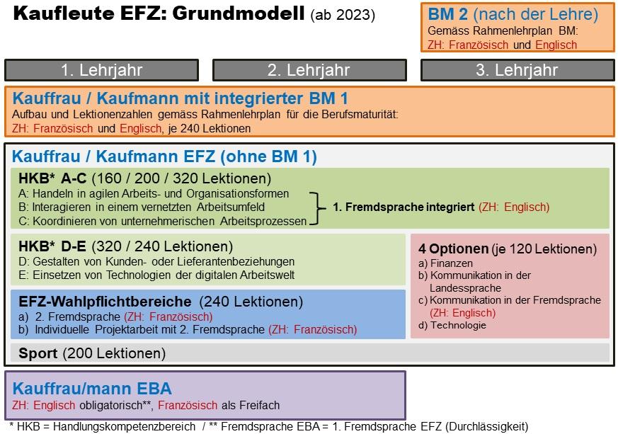 Am 16. August 2021 hat das Staatssekretariat für Bildung, Forschung und Innovation (SBFI) die revidierte Bildungsverordnung erlassen. Gemäss Art. 4 der Bildungsverordnung Kauffrau/Kaufmann mit eidgenössischem Fähigkeitszeugnis (EFZ) umfasst die Ausbildung eine erste und eine zweite Fremdsprache. Die erste Fremdsprache wird handlungsorientiert unterrichtet und ist im Berufskundeunterricht integriert. Die zweite Fremdsprache wird im Rahmen der beiden Wahlpflichtbereiche «Zweite Fremdsprache» und «Individuelle Projektarbeit» angeboten. Welche Fremdsprachen unterrichtet werden, bestimmt der Kanton.