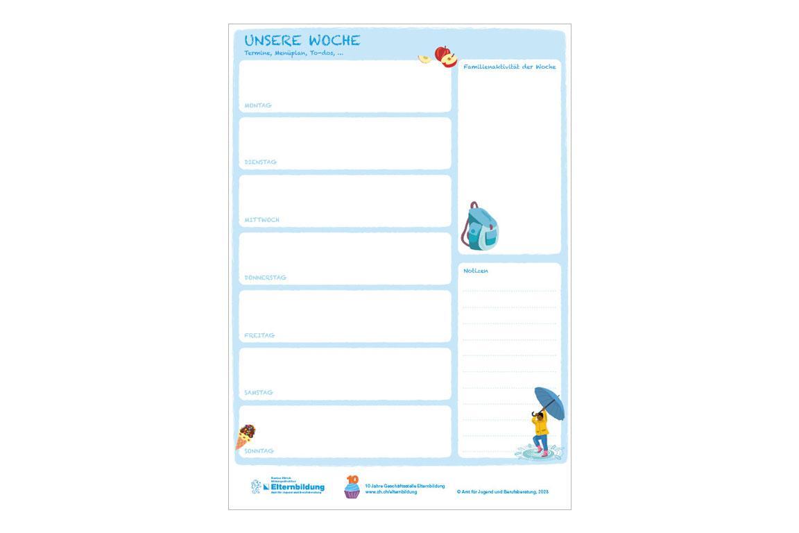 Die Geschäftsstelle Elternbildung hat im Rahmen ihres 10-jährigen Jubiläums einen Wochenplaner für Familien gestaltet. Der Wochenplaner kann an Eltern abgegeben werden und ist hier als Download erhältlich.