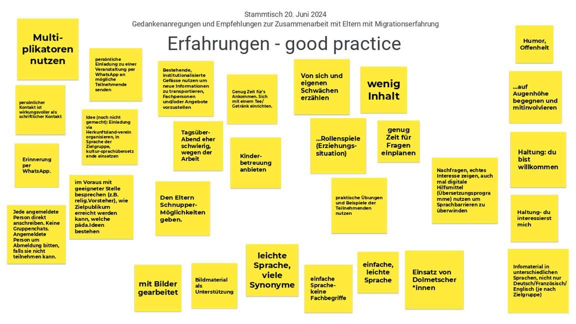 - sich der Ressource der Gruppe bewusst sein (eventuell reagieren Eltern besser auf Einwürfe oder Validierung der Gruppe)
