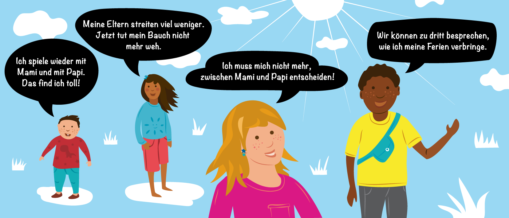 Die Eltern finden Lösungen, wie sie trotz Trennung oder Scheidung gute Eltern sein können. Die Wünsche und Bedürfnisse des Kindes werden berücksichtigt.