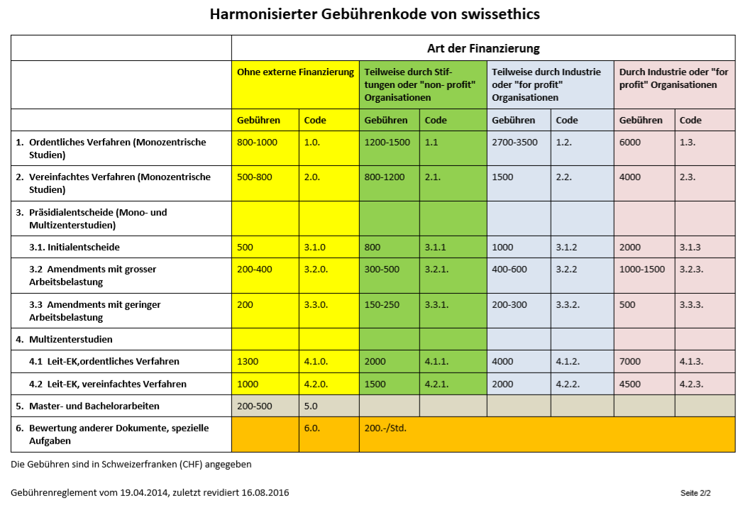 ¹Die Gebühren werden gemäss einem für alle Mitglieder von swissethics harmonisierten Tarifsystem berechnet. Die Tariftabelle sieht Bandbreiten vor, die jede Ethikkommission entsprechend dem erbrachten Aufwand anwenden kann.