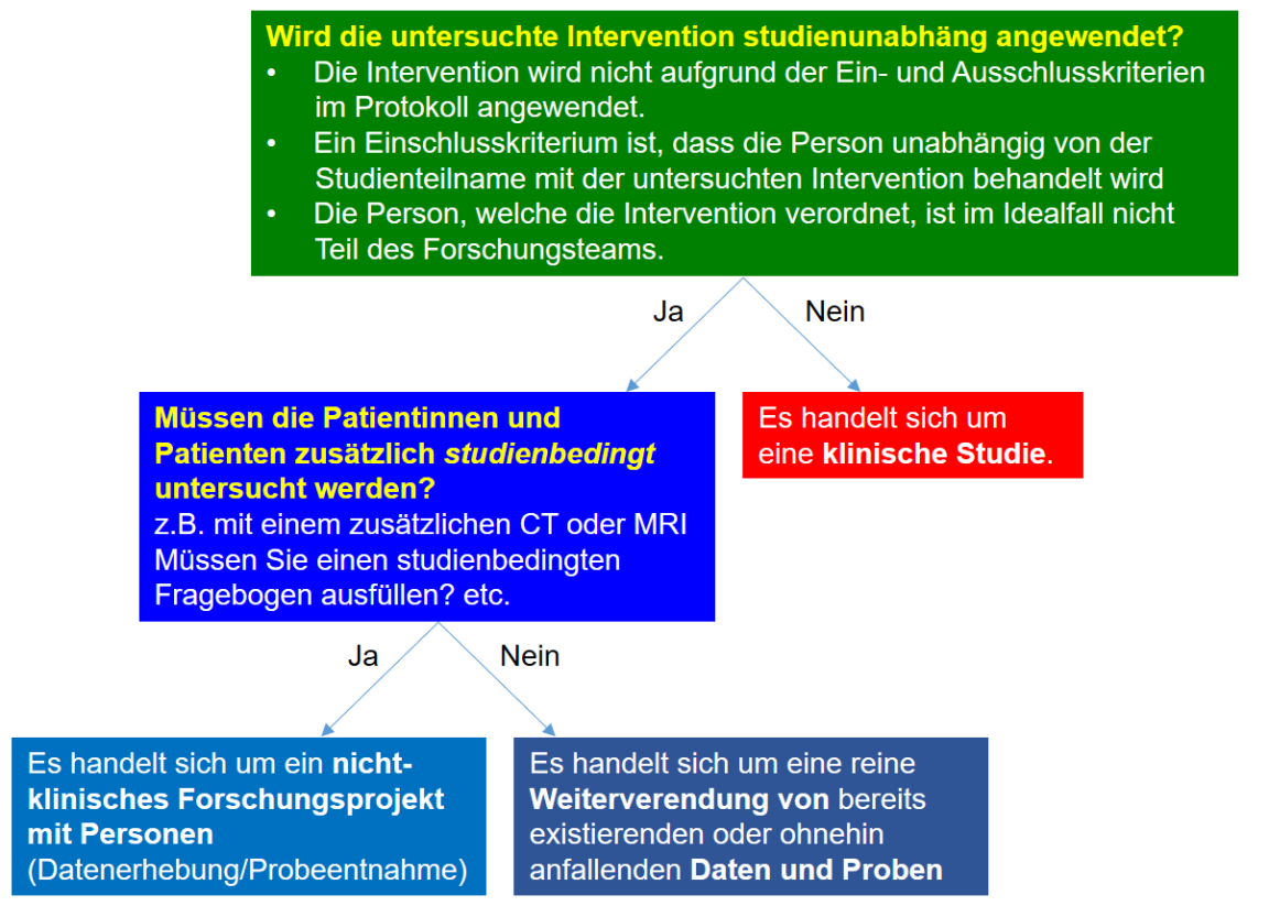 Oft ist die Einteilung klar, es gibt aber auch Vorhaben, die nicht so einfach einzuteilen sind. Im Zweifelsfall sollte man sich an die hausinternen Fachstellen (z.B. das Clinical Trials Center im USZ) wenden. Falls dann immer noch Unklarheiten bestehen, kontaktieren Sie bitte uns.