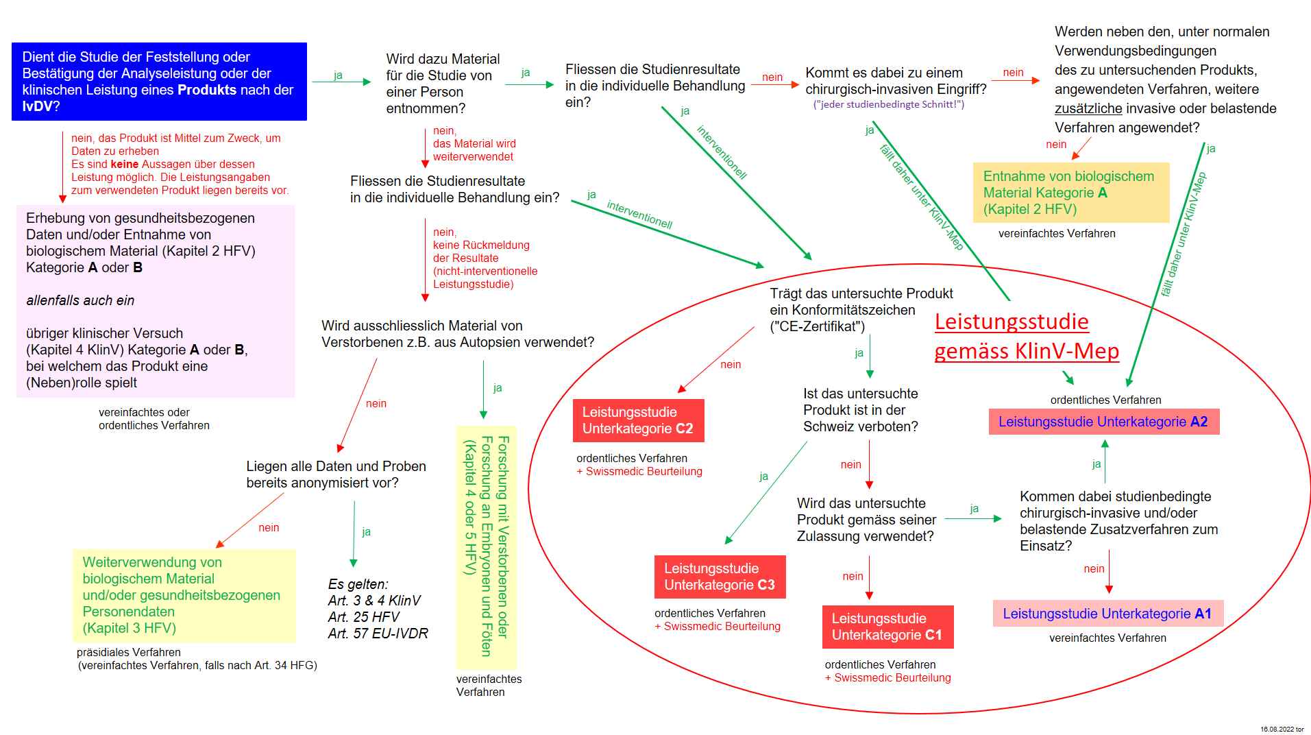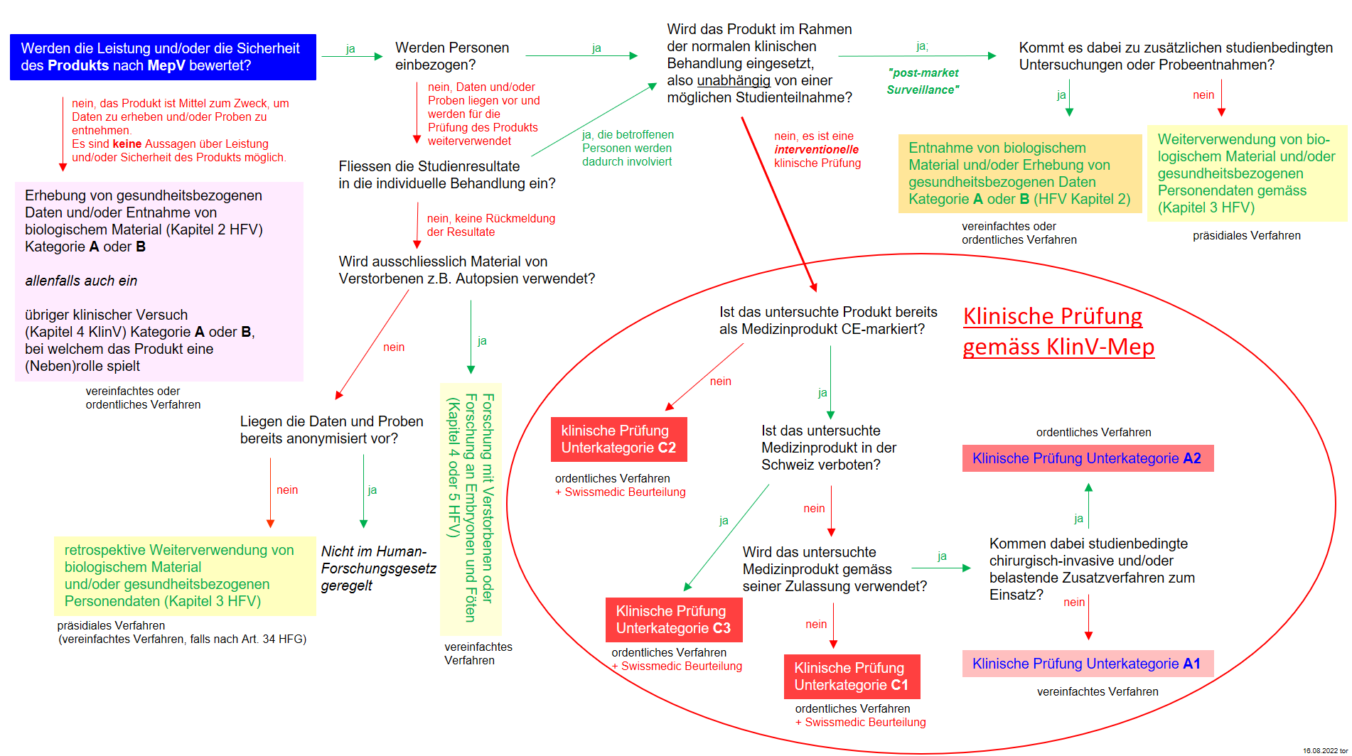 Forschungsprojekte mit Personen und klinische Versuche fallen in eine der Risikokategorien A, B oder C. Die Kategorie A ist dabei die tiefste Kategorie. Klinische Studie mit Medizinprodukten/In-vitro-Diagnostika werden noch in Unterkategorien A1 und A2 bzw. C1, C2 und C3 unterteilt.