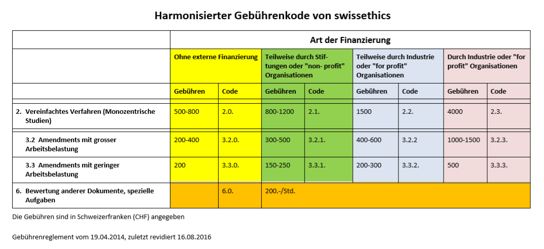 Gemäss Gebührenreglement vom 19.04.2014 (revidiert am 09.07.2018) von swissethics