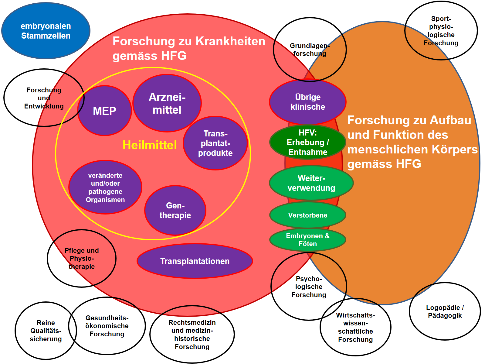 Die wichtigste Grundlage der Humanforschung stellt das Humanforschungsgesetz (HFG) dar. Die Verordnungen dazu (KlinV, KlinV-Mep, HFV und OV-HFG) regeln die klinischen Versuche, die nicht-klinischen Forschungsvorhaben sowie die Zusammensetzung der Ethikkommissionen.