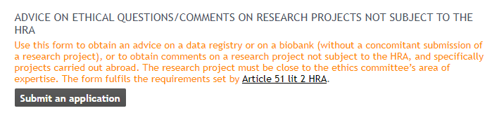 - Wählen Sie: «Advice on ethical questions/comments on research projects not subject to the HRA» (siehe Screenshot unten)