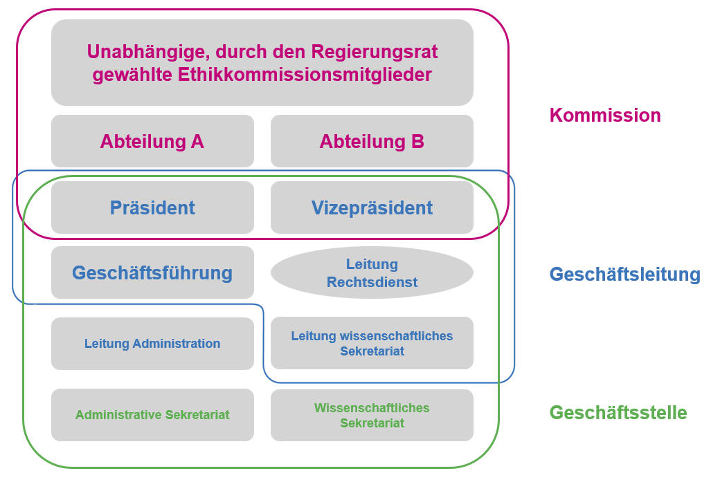 Wir verstehen uns als Einheit, die sich aus der Ethikkommission mit den beiden Fachabteilungen A und B sowie den Sekretariaten der Geschäftsstelle zusammensetzt.