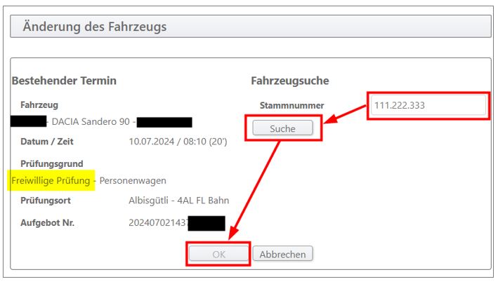 Bitte beachten Sie: Bestehende freiwillige Prüfungen können Sie bearbeiten. Das Fahrzeug mit einem bestehenden Termin kann durch ein anderes Fahrzeug ersetzt werden. Das ursprünglich disponiert Fahrzeug hat keinen Termin mehr.