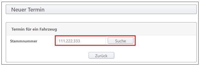 Geben Sie die Stammnummer ohne Abstände ein und klicken Sie auf «Suche». Wichtig: Die Stammnummer muss tatsächlich existieren und gültig sein.