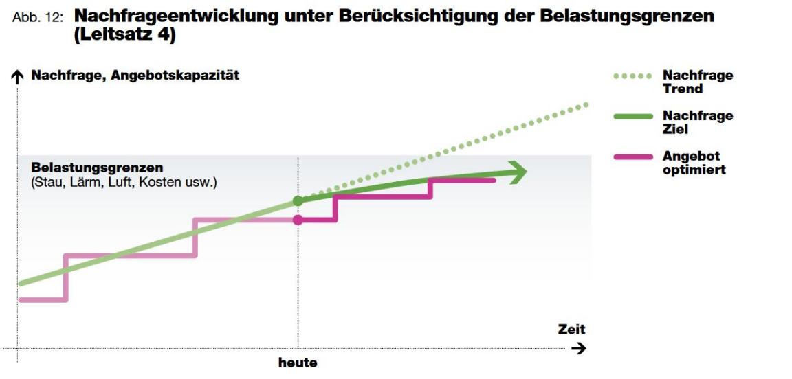 Die Mobilitätsbedürfnisse sollen möglichst ressourceneffizient mit dem öffentlichen Verkehr (öV) sowie dem Fuss- und Veloverkehr abgedeckt werden. Die zurückgelegten Wege sollen kürzer werden. Die Belastungsspitzen im motorisierten Individualverkehr (MIV) und öV sollen begrenzt werden. Es gilt, Wachstumsgrenzen zu respektieren, die Mobilität jedoch sicherzustellen.