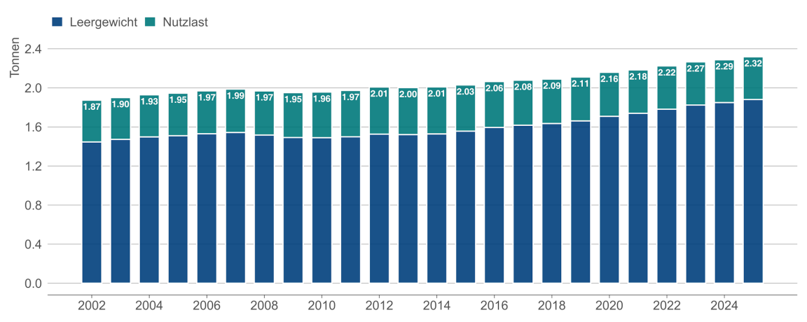 Die neu zugelassenen Autos bringen immer mehr Gewicht auf die Waage. Inzwischen sind sie im Schnitt knapp 1.9 Tonnen schwer. Zählt man noch die maximal zulässige Nutzlast hinzu, so ist man bei weit über zwei Tonnen pro Wagen.