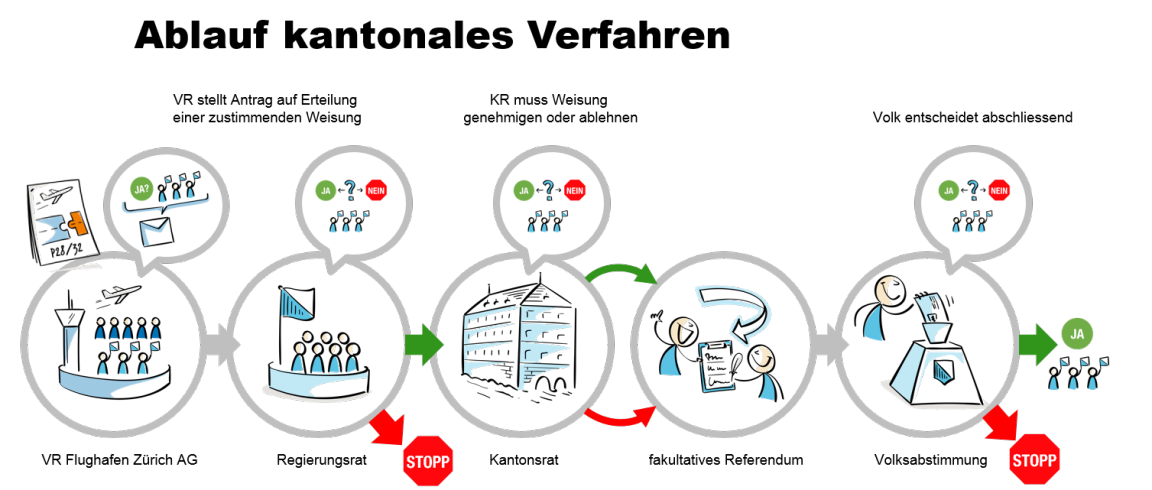 Verwaltungsratsbeschlüsse, welche die Änderung von Lage und Länge der Pisten betreffen, können nur mit Zustimmung der Staatsvertretung im Verwaltungsrat der Flughafen Zürich AG gefasst werden (Sperrminorität). Der Regierungsrat hat der Staatsvertretung im Verwaltungsrat der Flughafen Zürich AG am 19. Mai 2021 die Weisung erteilt, der Einleitung eines Plangenehmigungsverfahrens beim Bund für die Verlängerung der Pisten 28 und 32 zuzustimmen. Der Kantonsrat und das Zürcher Stimmvolk haben dies bestätigt.