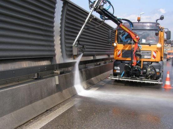 Sind diese Oberflächen verschmutzt, ist ihre Funktionsfähigkeit eingeschränkt. Die regelmässige Reinigung ist also notwendig, um die Immissionen auf das Nötigste zu reduzieren. Auf den Autobahnen in der Gebietseinheit VII werden rund 50'000 Quadratmeter Lärmschutzwände unterhalten.