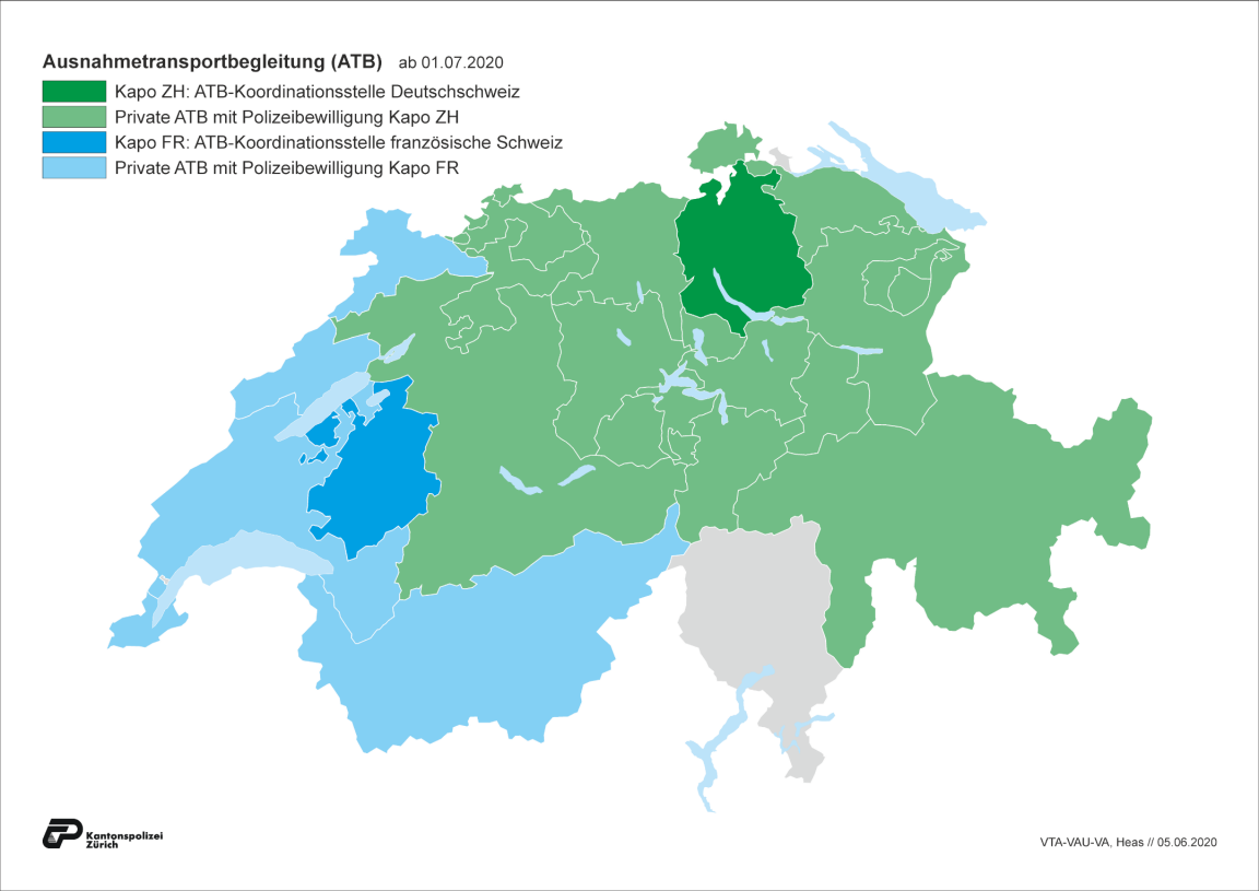 Für die Romandie bietet die Kantonspolizei Freiburg eine entsprechende Ausbildung an und stellt die ATB-Bewilligungen aus. Zwischen den Kantonspolizeien Freiburg und Zürich besteht eine enge Zusammenarbeit. Sie sorgen unter Einbezug der andern Polizeikorps dafür, dass für die ganze Schweiz einheitliche Vorgaben gelten.