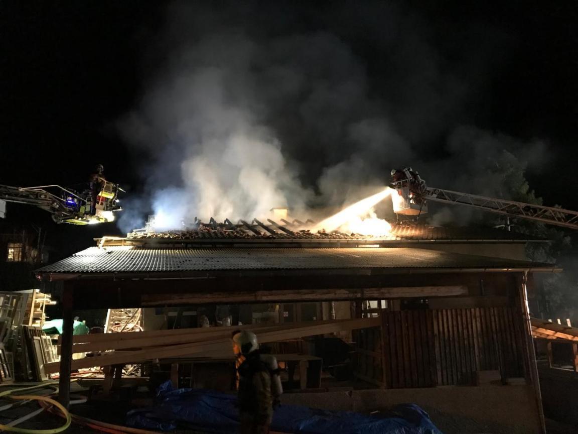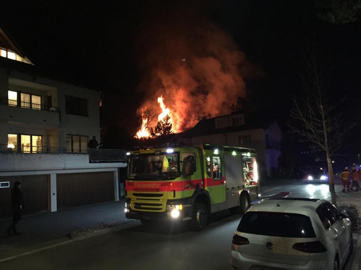 Um 19.30 Uhr ging die Meldung ein, dass das Dach einer Holzbaufirma am Rütiweg in Flammen stehe. Die sofort ausgerückten Rettungskräfte trafen das Gebäude schliesslich im Vollbrand an. Die Feuerwehr konnte den Brand rasch unter Kontrolle bringen und ein Übergreifen der Flammen auf die umliegenden Häuser verhindern. Die Bewohner der Nachbarliegenschaften wurden angewiesen, wegen des dichten Rauchs die Fenster zu schliessen. Die Löscharbeiten dauerten mehrere Stunden an. Zum Zeitpunkt des Brandausbruchs befanden sich keine Personen im betroffenen Gebäude, sodass niemand verletzt wurde. Während der Löscharbeiten blieben die Alte Landstrasse sowie der Rütiweg für den Verkehr gesperrt. Der entstandene Sachschaden kann momentan noch nicht beziffert werden, dürfte aber mehrere hunderttausend Franken übersteigen.