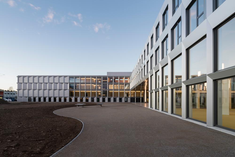 Das Bildungszentrum besteht aus einem Ringtrakt, der den Schulhof umschliesst, und aus dem daran anschliessenden Sporttrakt mit seinen beiden Dreifachsporthallen. Im Erdgeschoss sind die gemeinsamen Nutzungen wie die Mediothek, die Mensa und die Naturwissenschaften angeordnet, in den beiden Obergeschossen alle Klassen-, Vorbereitungs- und Verwaltungsräume. Das Raumangebot erfüllt die aktuellen spezifischen Bedürfnisse und bietet dank hoher Flexibilität gleichzeitig Optionen für künftige Entwicklungen.