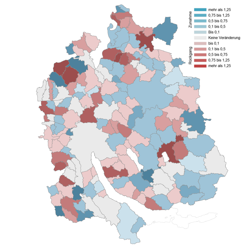 In insgesamt 86 Gemeinden ging die Zahl der Leerstände um total 1373 Wohnungen zurück. Dominiert wurde der Rückgang von den Gemeinden Pfäffikon (–153), Zürich (–141), Küsnacht (–92) und Rümlang (–80), in 34 weiteren Gemeinden reduzierte sich die Zahl der leerstehenden Wohnungen um zehn oder mehr. Umgekehrt stieg die Zahl der Leerstände in 62 Gemeinden um total 698 Wohnungen. Den grössten Beitrag zu diesem Anstieg leisten die Gemeinden Winterthur (+110) und Uster (+53). Lediglich in 18 Gemeinden wuchs der Leerstand um mehr als 10 Wohnungen.