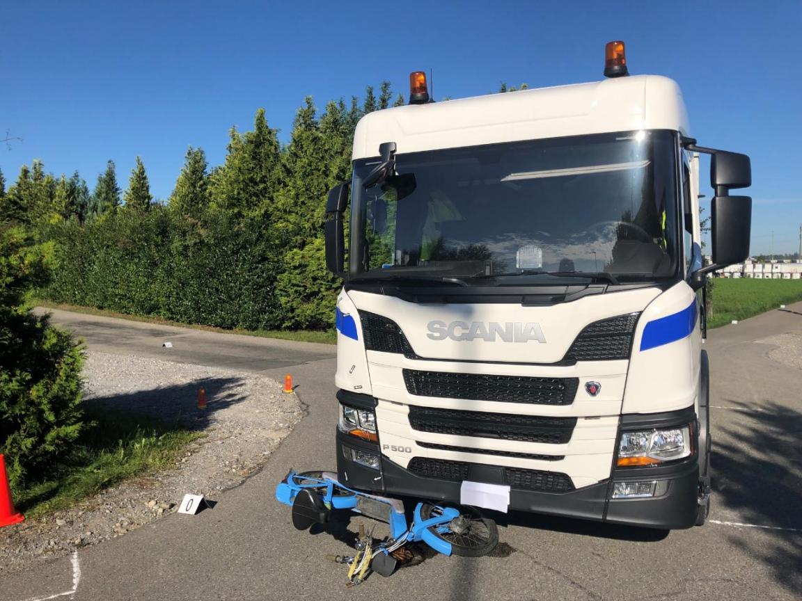 Bei einer Kollision zwischen einem Lastwagen und einer Motorfahrradlenkerin hat sich am Donnerstagmorgen (12.9.2019) in Wangen (Gemeindegebiet Wangen-Brüttisellen) die Zweiradfahrerin schwere Verletzungen zugezogen.