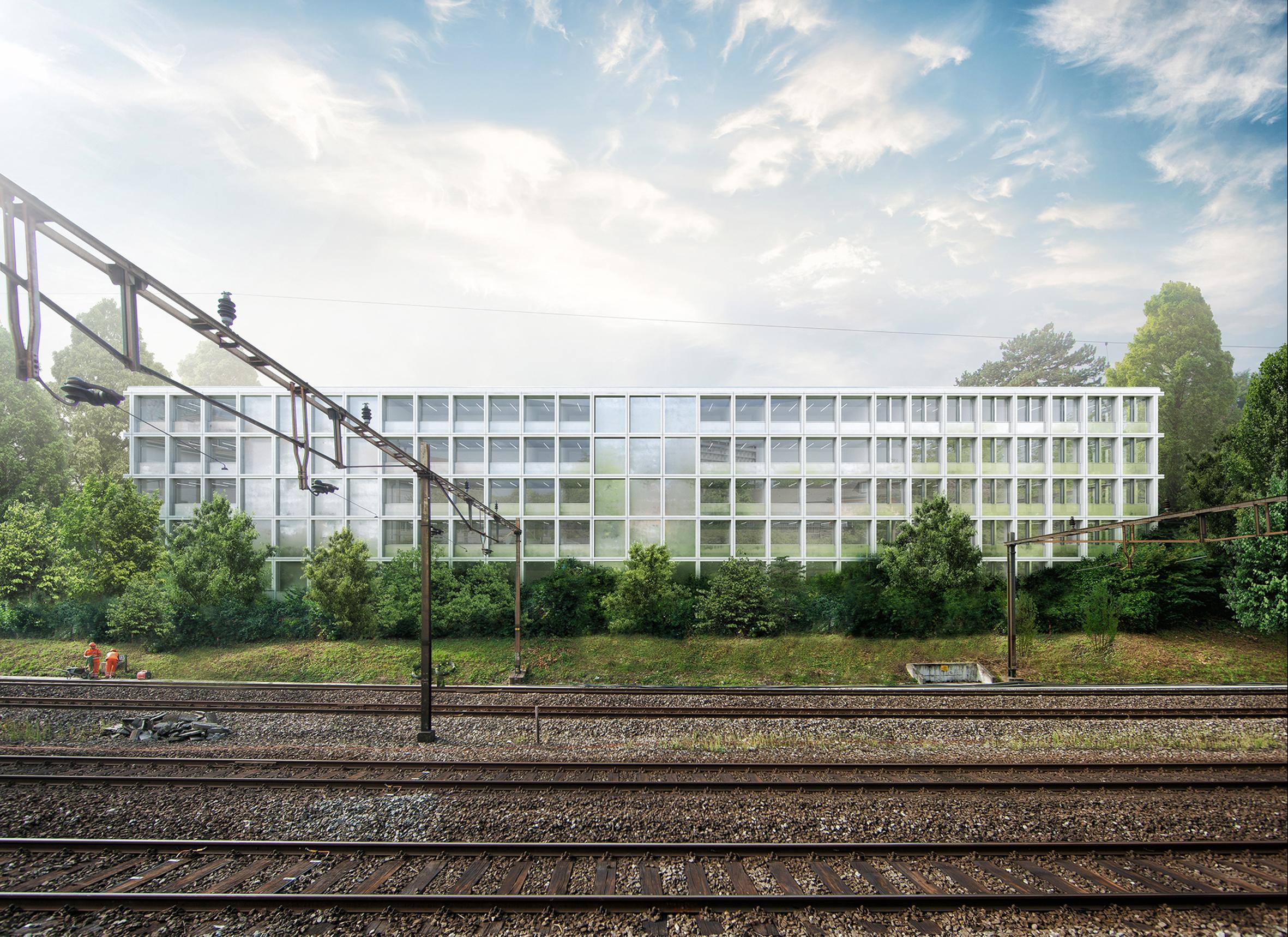Fünfgeschossiger Neubau entlang der Bahngeleise