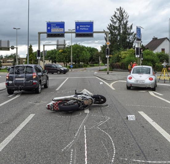 Bei einem Verkehrsunfall zwischen zwei Personenwagen und einem Motorrad ist am Sonntagnachmittag (08.08.2021) in Hinwil der Zweiradfahrer schwer verletzt worden.