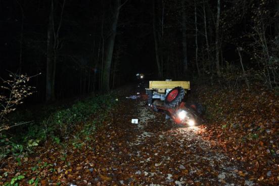 Gegen 2 Uhr lenkte ein 20-jähriger Mann einen landwirtschaftlichen Motoreinachser mit Anhänger auf der steilen Waldstrasse (Stadtweg) talwärts Richtung Fussballplatz «Pflumenäcker». Auf dem Gefährt befanden sich ein 57-jähriger Beifahrer sowie auf dem Anhänger sechs weitere Personen im Alter zwischen 26 und 51 Jahren. Aus zurzeit nicht bekannten Gründen geriet die Komposition nach links an die Böschung. Daraufhin kippte der Motoreinachser nach rechts wobei der Lenker und der Beifahrer herunterfielen und sich schwere Verletzungen zuzogen. Nach der Erstversorgung durch ein Ambulanzteam wurden Sie mit Rettungshelikoptern ins Spital geflogen.