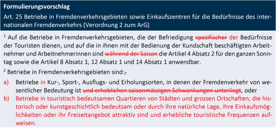 Damit Städte touristisch attraktiv sind, braucht es belebte Zentren. Dazu zählen nebst einem attraktiven Freizeit- und Kulturangebot, auch Einkaufsmöglichkeiten an den Wochenenden in touristischen Quartieren, wie dies in klassischen Berg-Destinationen bereits seit langem möglich ist. Und es braucht einen stärkeren Fokus auf einen nachhaltigen Tourismus mit mehr Gästen auch aus der Region, der Schweiz und aus Europa. Die kantonalen Regierungsmitglieder fordern für diese Transformation möglichst grosse Handlungsfreiheit auch in regulatorischer Hinsicht. So soll als eine wichtige Massnahme die Verordnung zum Arbeitsgesetz mit einem Passus ergänzt werden, um auch in Städten und grossen Ortschaften Tourismuszonen zu ermöglichen, wie dies in den meisten Bergkantonen bereits heute der Fall ist: