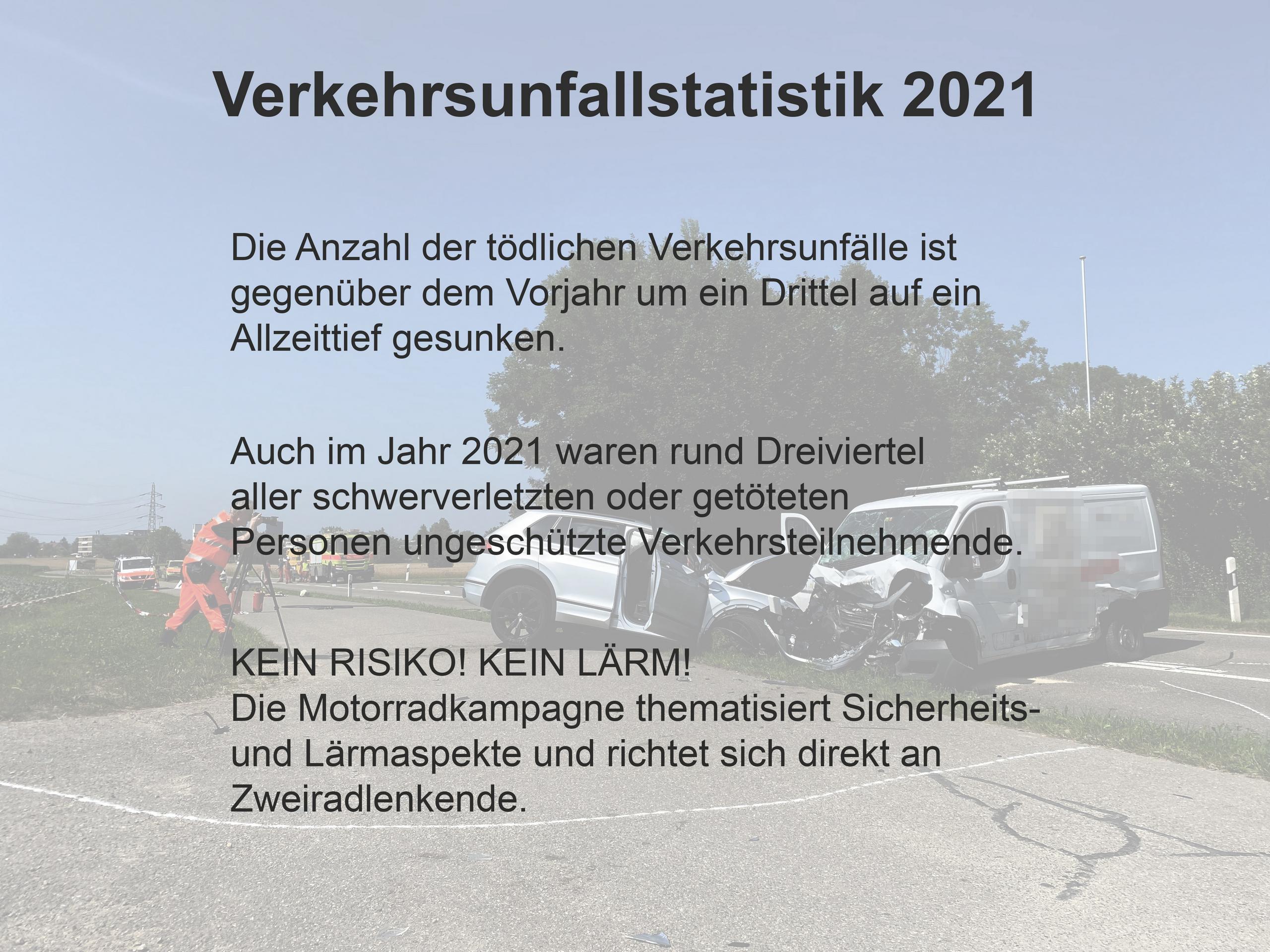 In Ergänzung der bewährten und seit 2015 laufenden Fussgänger- und E-Bike-Kampagne «Weniger Seniorenunfälle» führt die Kantonspolizei Zürich, zusammen mit dem Tiefbauamt als Strasseneigentümer und zuständiger Lärmschutzbehörde, die im 2021 lancierte, und ebenfalls mehrjährig angelegte, Motorradkampagne weiter. Diese thematisiert Sicherheits- wie auch Lärmaspekte und richtet ihre Appelle «KEIN RISIKO!» und «KEIN LÄRM!» direkt an die Motorradlenkenden.
