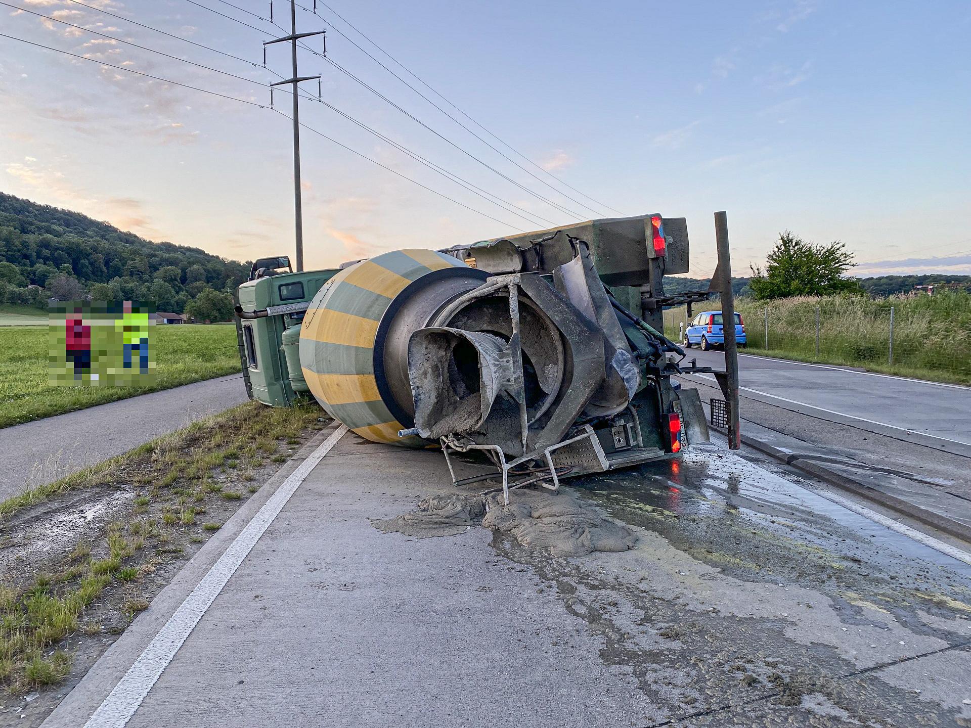 Am frühen Montagmorgen (30.05.2022) ist im Kreisel Chrüzstrasse in Bülach ein beladener Fahrmischer beim Verlassen des Kreisels zur Seite gekippt. Der Fahrer hat sich dabei leichte Verletzungen zugezogen.