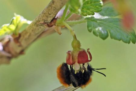 Wildbienen bestäuben Beeren, Obst, Gemüse und Kräuter. Dieses Fuchsrote Sandbiene macht sich gerade an einer Johannisbeerblüte zu schaffen. Quelle: Christine Dobler Gross -