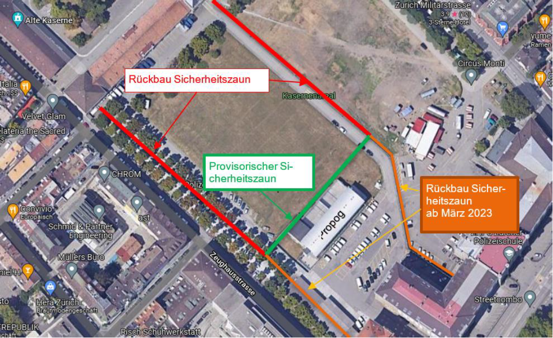 Mit dem Umzug ins Polizei- und Justizzentrum Zürich (PJZ) braucht die Kantonspolizei sowohl das provisorische Polizeigefängnis (Propog) als auch die anderen Gebäude auf dem Kasernenareal nicht mehr für eigene Zwecke. Der Kanton Zürich hat nun entschieden, den Sicherheitszaun, der das Propog umgibt, ab Dienstag, 12. Juli, zurückzubauen. Damit wird ein Grossteil der Kasernenwiese wieder frei zugänglich sein. Der Rückbau des Propog ist ab dem ersten Quartal 2023 geplant. Danach ist die Kasernenwiese wieder vollständig frei zugänglich. Regierungsrat Martin Neukom, Baudirektor, hält dazu fest: «Der Bevölkerung wurde versprochen, dass das Kasernenareal nach dem Bau des PJZ geöffnet wird. Ich freue mich sehr, dass wir dieses Versprechen jetzt in die Tat umsetzen können.»