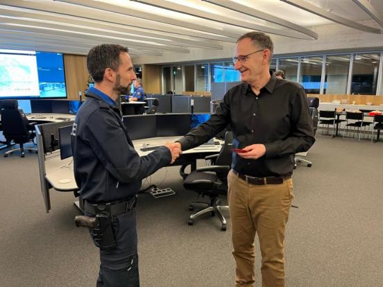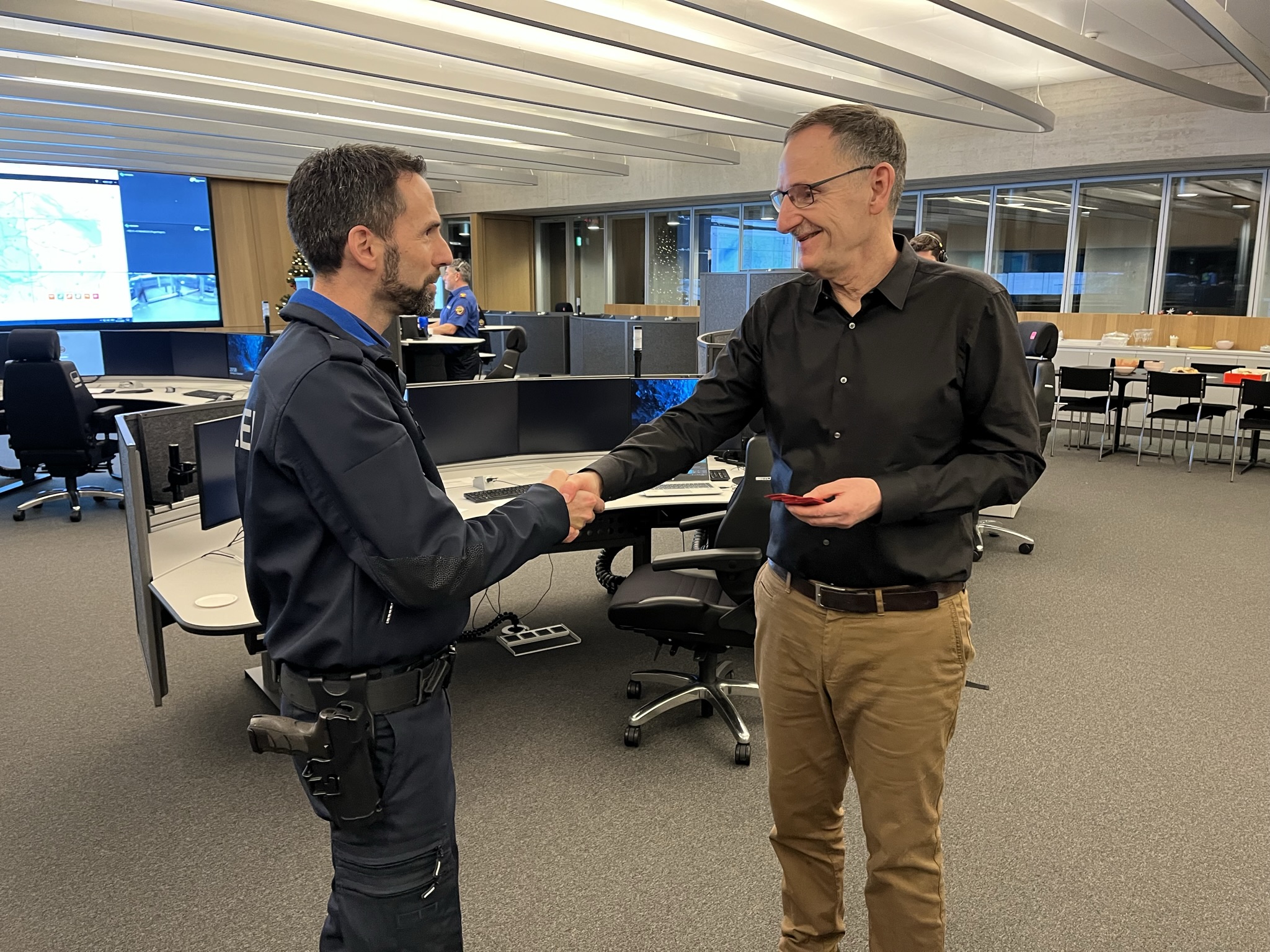Zuvor hatten sich Regierungsrat Mario Fehr und Kommandant Marius Weyermann ein Bild von der Polizeiarbeit in der Silvesternacht (31.12.2022) gemacht und den Einsatzkräften für ihre Arbeit gedankt. Ihr Rundgang führte sie zur Flughafenpolizei, zur Regionalpolizei im Zürcher Oberland und schliesslich ins Polizei- und Justizzentrum und in die Einsatzzentrale. Hierbei wurden sie teilweise begleitet von Kantonsrätin Andrea Gisler, den Kantonsräten Markus Schaaf und Tobias Mani sowie Peter Reinhard, Präsident des Verbands der Sicherheitsbeauftragten der Flughafenpolizei.