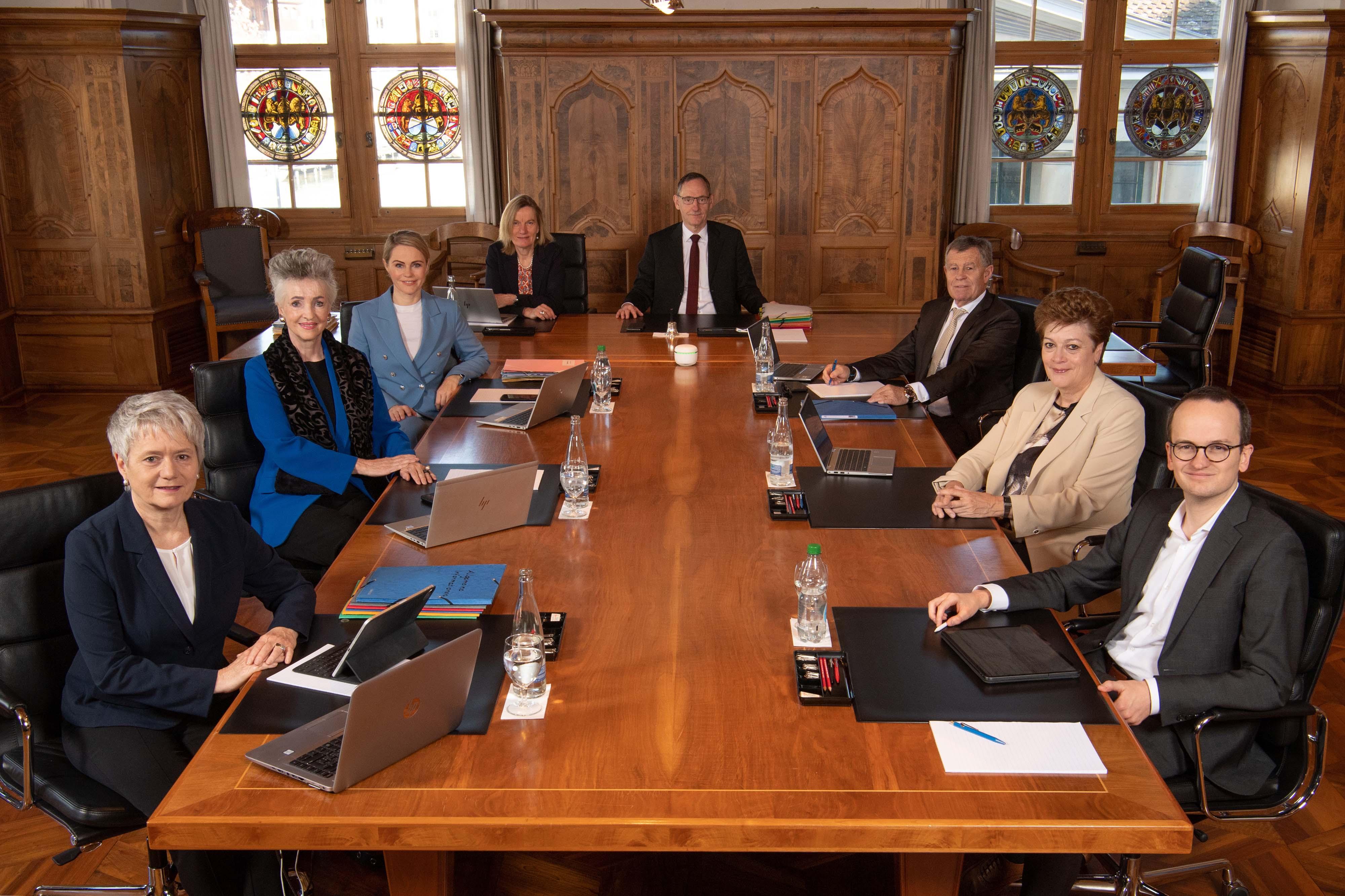 Das Regierungsfoto zeigt den Regierungsrat im Regierungszimmer des Zürcher Rathauses. Dort trifft sich der Regierungsrat jeweils mittwochs zu seinen ordentlichen Sitzungen. Aufgrund der bevorstehenden Renovation des Rathauses wird der Regierungsrat in absehbarer Zeit seine Sitzungen bis auf Weiteres an einem anderen Ort abhalten.