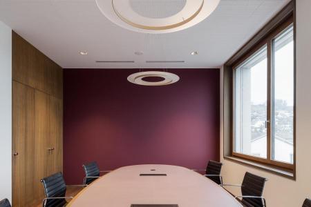 Im Neubau sind die publikumsintensiven Nutzungen wie z.B. Gerichtssäle, Besprechungszimmer und Dialogräume zusammengelegt. Quelle: Beat Bühler Bild «Ein Dialograum des Bezirksgerichts Meilen» herunterladen