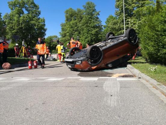 Kurz nach 10 Uhr fuhr eine 70-jährige Frau mit ihrem Personenwagen in Richtung Einmündung Riedener/Loorenstrasse. Im Bereich der Einmündung geriet ihr Fahrzeug aus noch ungeklärten Gründen auf den rechten Fahrbahnrand der Loorenstrasse. Dort kollidierte es mit einem Steinpoller und schleuderte zurück auf die Fahrbahn, wo es auf dem Dach liegen blieb.