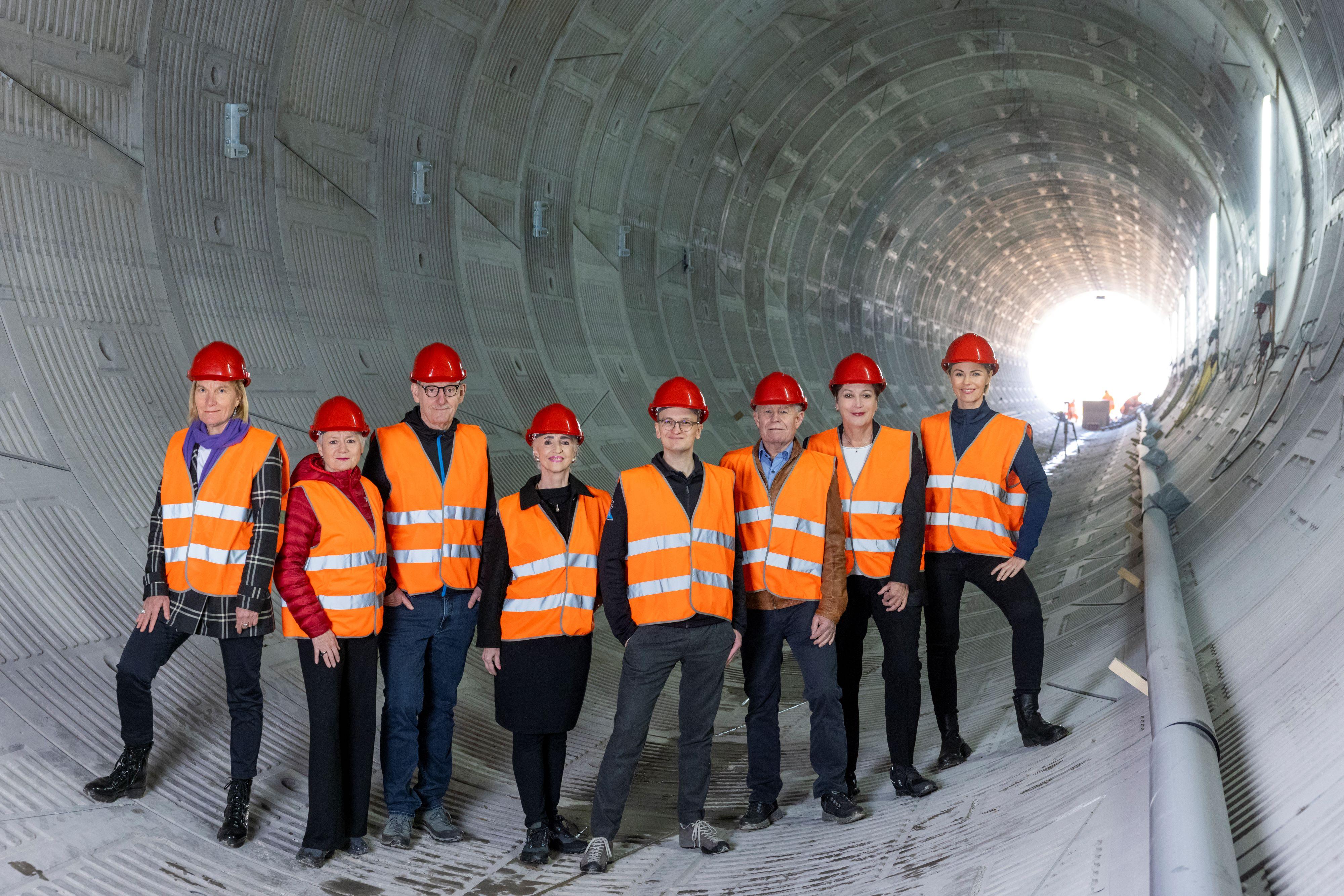 Das neue Regierungsfoto zeigt den Regierungsrat im Entlastungsstollen Sihl-Zürichsee kurz vor der Mündung in den Zürichsee bei Thalwil. Der Stollen ermöglicht ab 2026 die Überleitung von Hochwasserspitzen der Sihl in den Zürichsee. Bei einem extremen Sihl-Hochwasser drohen allein in der Stadt Zürich Gebäudeschäden von über 6 Mrd. Franken. Der rund zwei Kilometer lange Stollen mit einem Innendurchmesser von 6,6 Metern beseitigt das mit Abstand grösste Hochwasserrisiko im Kanton Zürich.