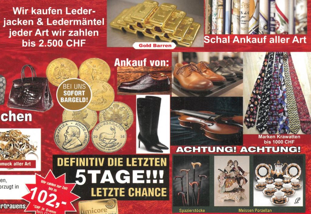 Die Kantonspolizei Zürich empfiehlt Gold, Schmuck und andere Wertgegenstände an autorisierte oder vertrauenswürdige Händler zu verkaufen. Händler müssen für den Ankauf von Edelmetallen bei der eidgenössischen Edelmetallkontrolle regis-triert sein (Liste).