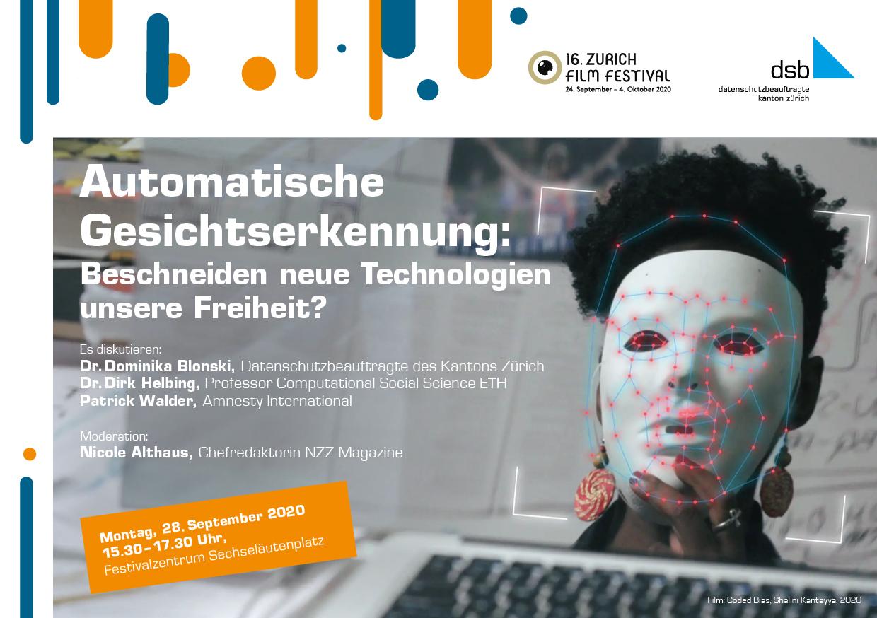 Die Sicherheitsdispositive unserer Gesellschaft vertrauen zunehmend auf Künstliche Intelligenz. Welche Auswirkungen hat dies auf unsere Freiheiten? Wo liegen die Gefahren der automatischen Gesichtserkennung? Im ZFF Talk vom Montag, 28. September diskutieren die Datenschutzbeauftragte Dr. Dominika Blonski, ETH-Professor Dirk Helbing und Patrick Walder von Amnesty International unter der Leitung von Nicole Althaus, NZZ Chefredaktion.