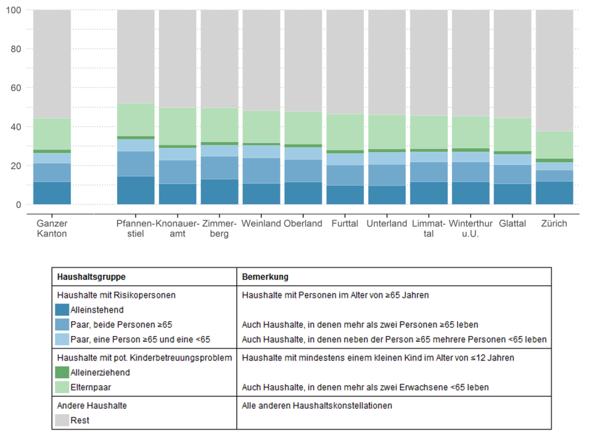 Die folgende Grafik zeigt, dass in gut einem Viertel der Zürcher Privathaushalte mindestens eine Person lebt, die im Rentenalter ist und damit zur Risikogruppe zählt (blau). Ein weiteres knappes Fünftel der Haushalte hat ein potenzielles Kinderbetreuungsproblem, weil mindestens ein Kind im Alter von 0 bis 12 Jahren zum Haushalt gehört (grün). Zusammen machen die beiden besonders durch den Lockdown betroffenen Gruppen rund 44 Prozent aller Privathaushalte aus. Dieser Prozentanteil schwankt je nach Region: Am höchsten ist er mit 52 Prozent am Pfannenstiel, am tiefsten mit 38 Prozent in der Stadt Zürich.