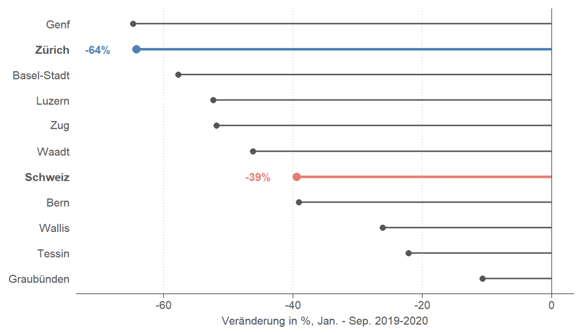 In den ersten neun Monaten des Jahres verzeichnet der Kanton Zürich üblicherweise rund drei Viertel aller Logiernächte. Während 2019 bis Ende September über 4.6 Millionen Übernachtungen gezählt wurden, sind es in diesem Jahr lediglich 1.6 Millionen, es «fehlen» also rund drei Millionen Logiernächte. Relativ gesehen beträgt der Rückgang satte 64 Prozent. Damit zählt der Kanton Zürich zu den grossen Verlierern unter den Schweizer Tourismusregionen. Nur im Kanton Genf ist der Rückgang noch etwas stärker. Besonders vom Einbruch der Übernachtungszahlen betroffen sind die städtischen Kantone, eben Genf und Zürich, aber auch Basel-Stadt und Luzern. Die typischen Tourismuskantone wie Graubünden, Wallis oder Tessin hielten sich dagegen besser, sie konnten die fehlenden ausländischen Gäste zumindest teilweise mit Gästen aus der Schweiz kompensieren.